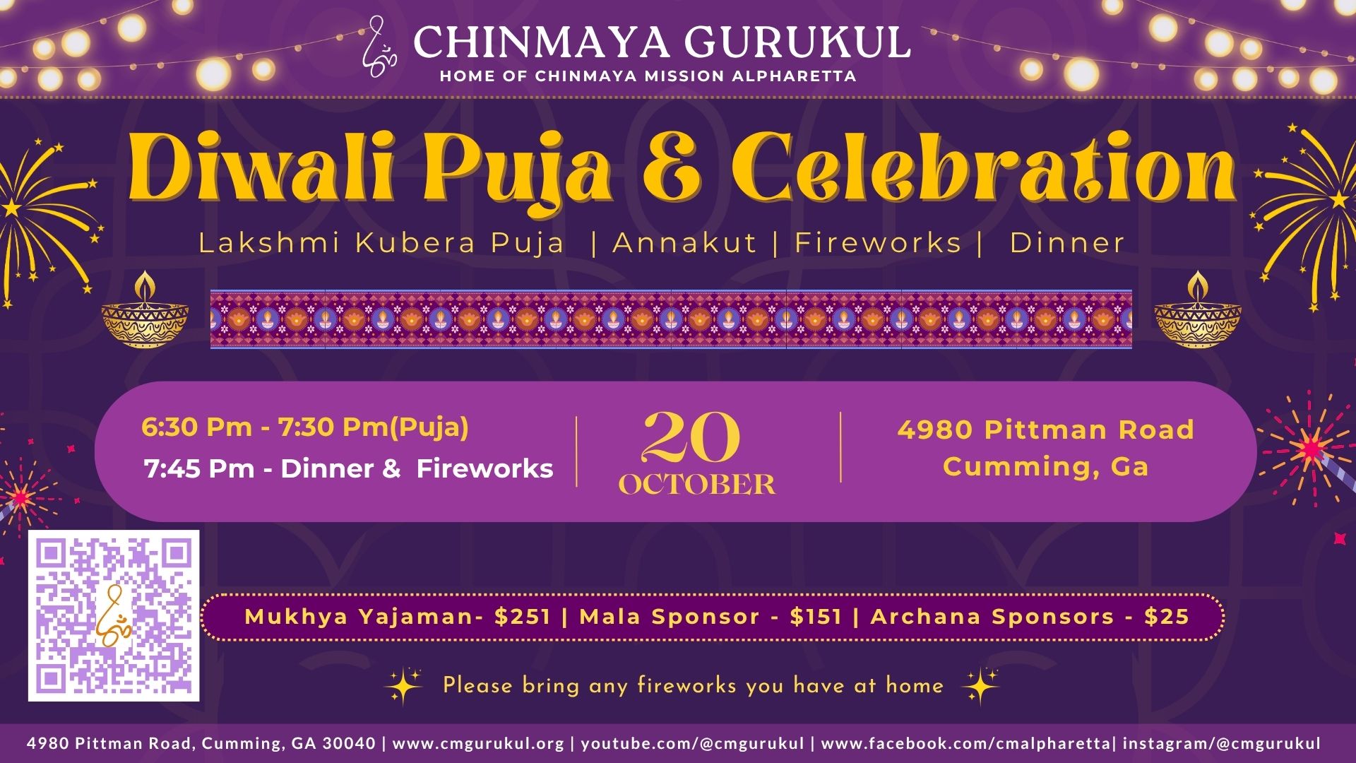 Share Diwali sweets and snacks to offer Annakut to our Sundar Krishna. Let’s have a SPARKLING DIWALI with the CMA Family !!! You are welcome to bring Fireworks .