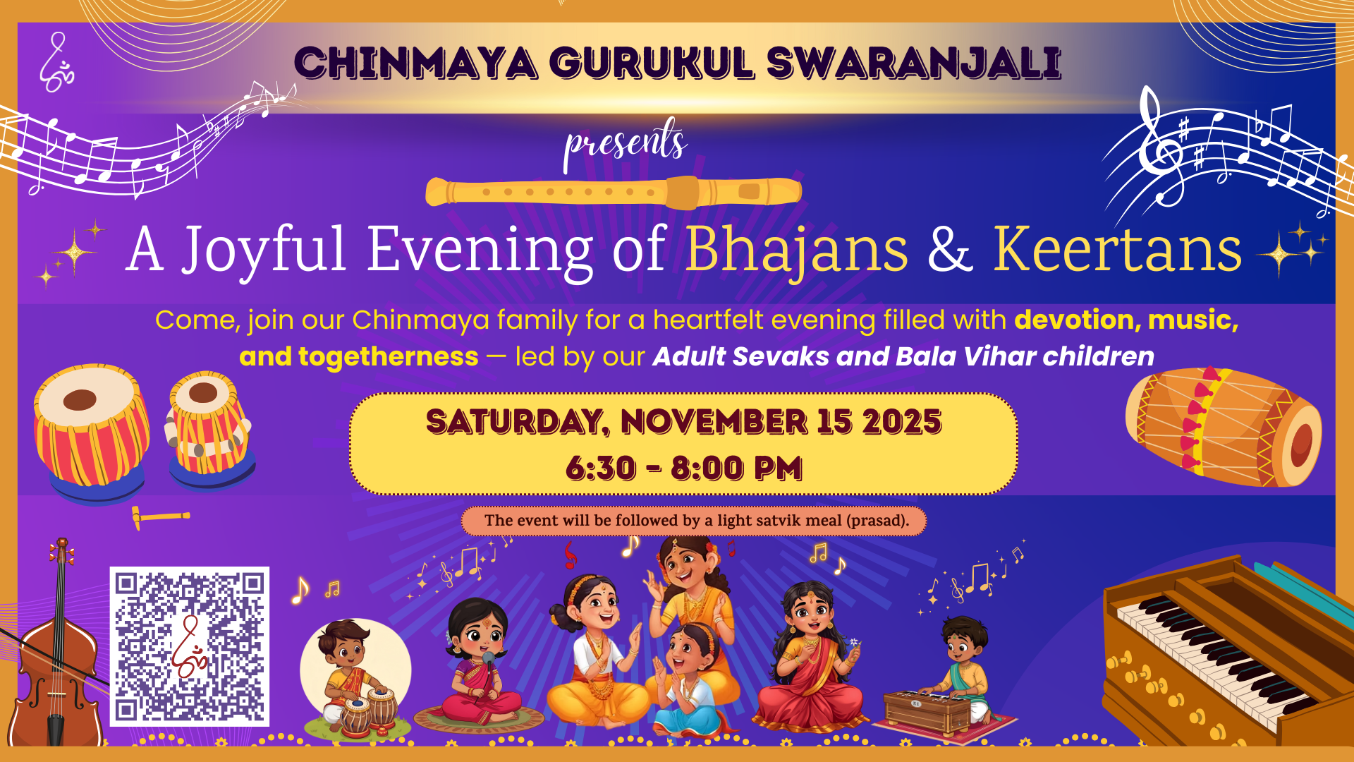 Come join our Chinmaya family for a heartfelt evening of devotion, music, and togetherness, led by our Adult Sevaks and Bala Vihar children.