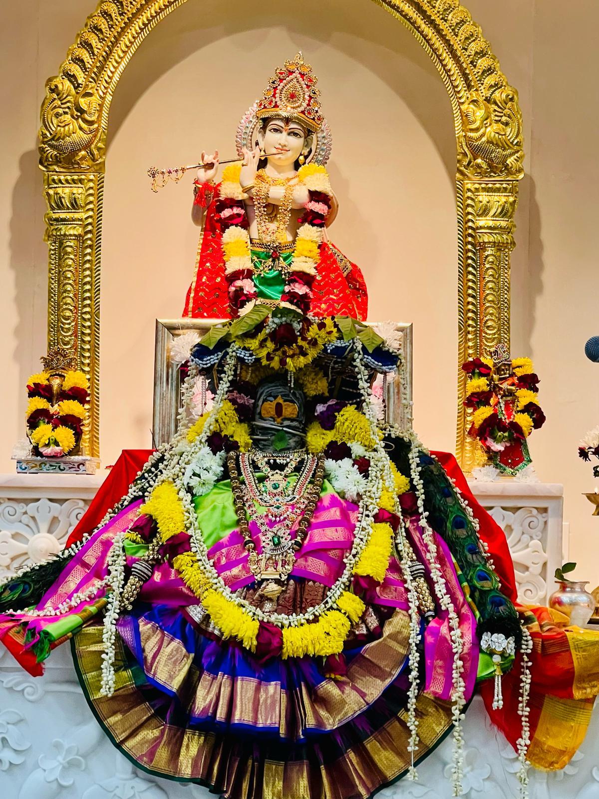The puja started promptly at 6:00 pm. As everyone entered, they were greeted with beautiful music from the Swaranjali Team and tikka marks anointed by smiling sevaks. All the preparation was done, with Sundar Krishna looking beautiful in his new dress lovingly provided by a sevak. The altar was decorated with malas and all the puja items were ready .