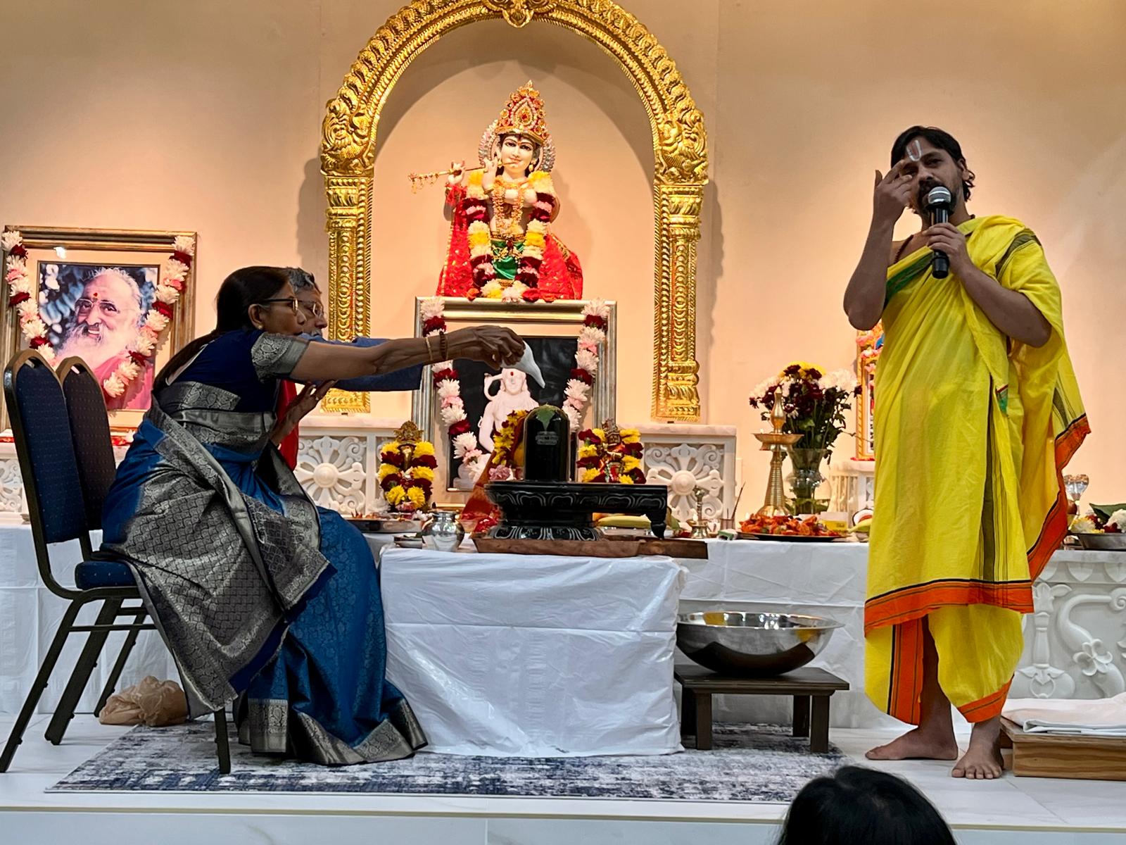 The priest Ravi Shankar ji started the puja promptly at 6:00 with Ganesha Puja. The Mukhya Yajamans were seated on stage and we had 10 yajamans who were also going to follow along with the puja . The Abhishekham started with oil followed by Water, followed by milk, yogurt, ghee , Coconut water, Orange Juice, honey, sugar and Panchamrut. Bhagwan Shiva is considered ‘Abhisheka Priya’ and offering of these various items symbolizes the cleansing of ones mind through the one pointed pouring of the items. It is meditative ritual to purify our ego. Through all of this, Ganapathi Atharva Shirsham, Lagunyasam, Narayana Suktam, Purusha Suktam, Rudram and various other chants were led by Sushma ji and Ravi Shankar ji.