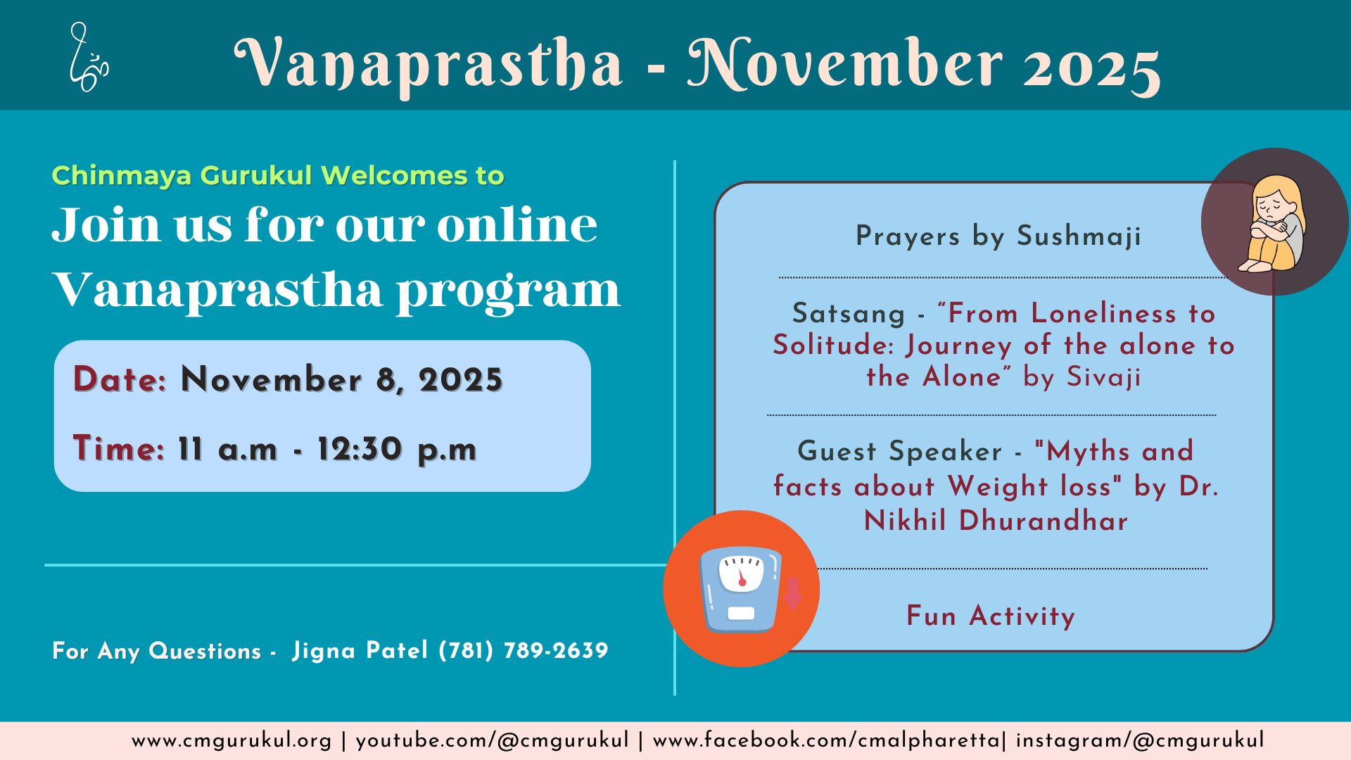 November 8 @ 5:30 pm - 6:30 pm Vivekachoodamani Adult Class Vivekachoodamani Adult Class Chinmaya Gurukul 4980 Pittman Rd., GA, United States Vivekachoodamani Adult Class